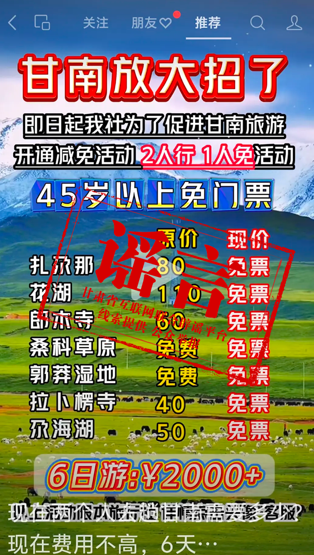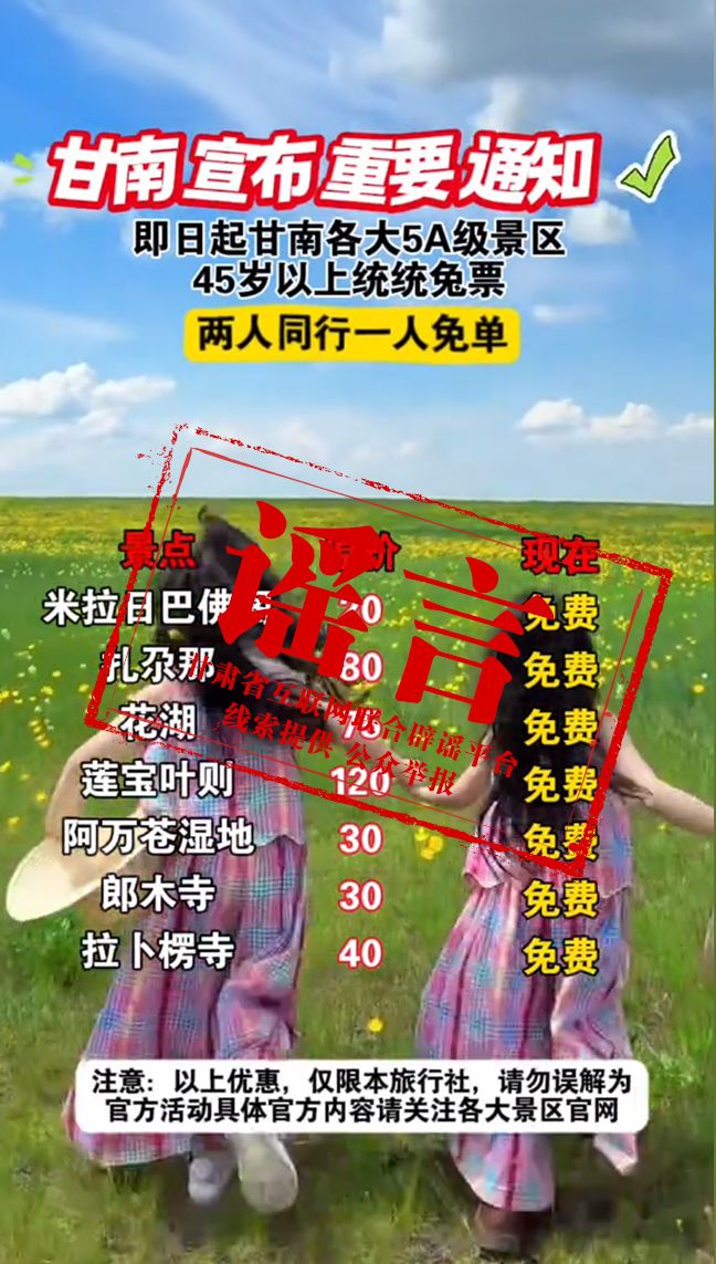 近日,個別旅行社營銷賬號在微信視頻號、抖音等部分網絡平臺上發布“甘南各大景區45歲以上游客免票”“甘南旅游局推出45歲以上景區免票政策”等不實信息,此類信息系虛假宣傳,切勿相信。