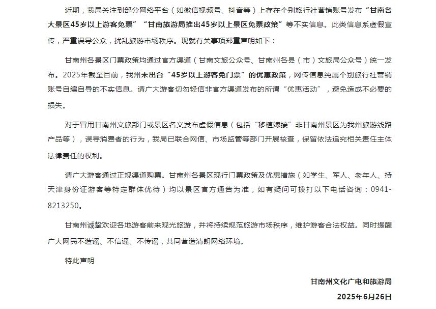 6月26日,甘南州文化廣電和旅游局發布聲明稱,2025年至目前,甘南州未出臺“45歲以上游客免門票”的優惠政策,網傳信息屬個別旅行社營銷賬號自編自導的不實信息。請廣大游客切勿輕信非官方渠道發布的所謂“優惠活動”,避免造成不必要的損失。